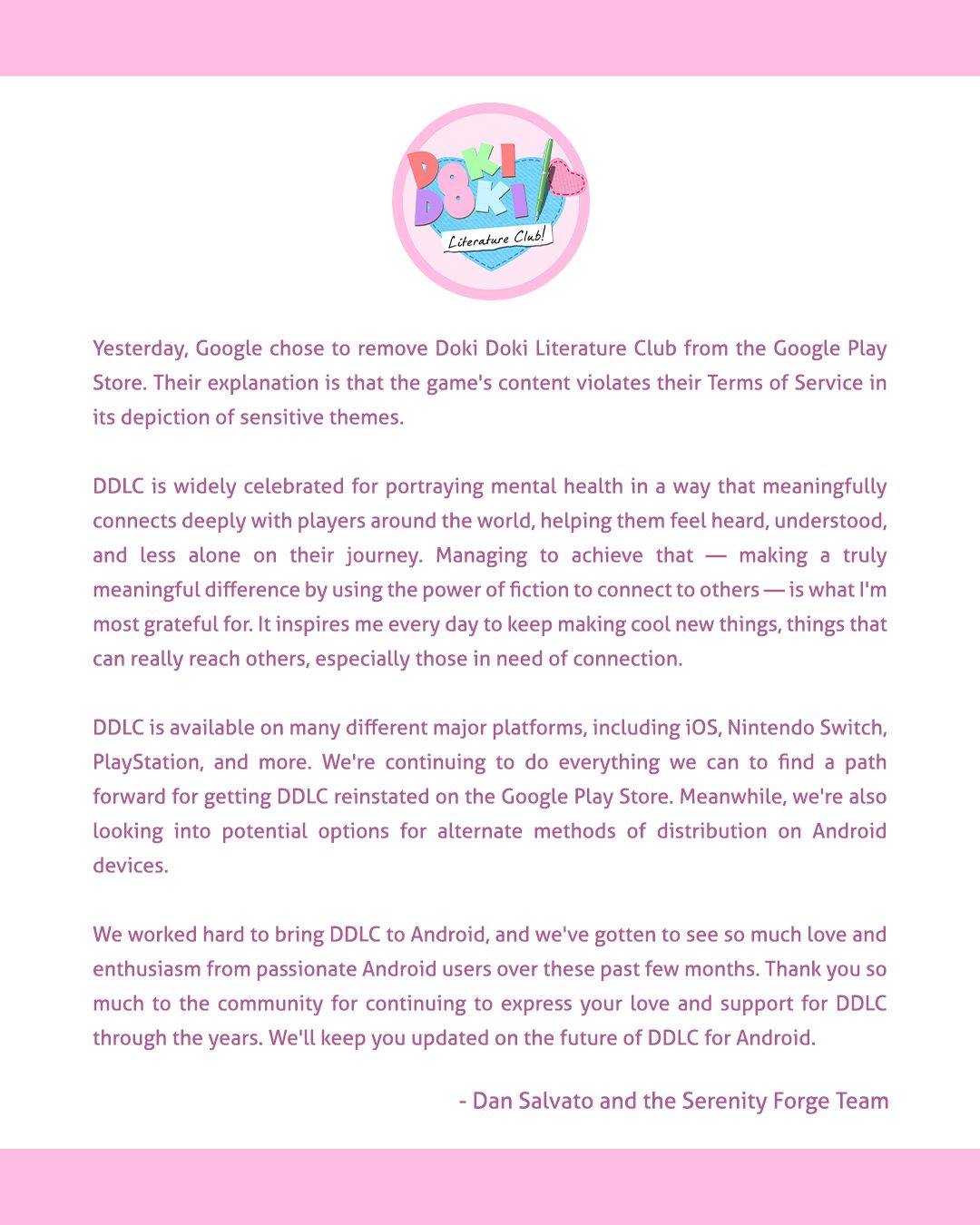 So, yesterday Dan Salvato posted on the Serenity Forge Facebook feed that Doki Doki Literature Club Plus was just taken down from the Google Play Store. In other words, there’s no direct way to play it on Android devices now. According to the post, it was removed because it violates Google Play’s terms of service because of its depiction of sensitive themes. This comes only four months after it was released on Android and iOS, though it’s been available on PC, Mac, and every current console for some time.